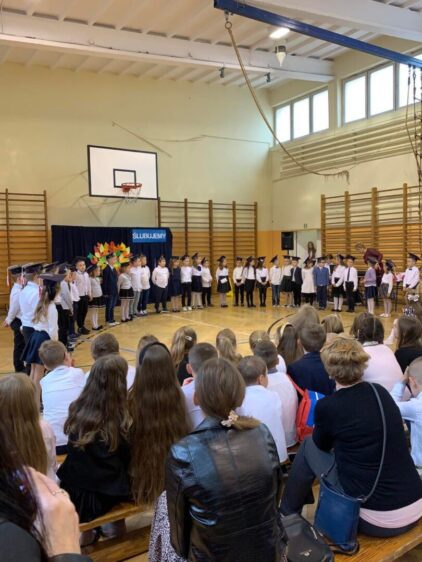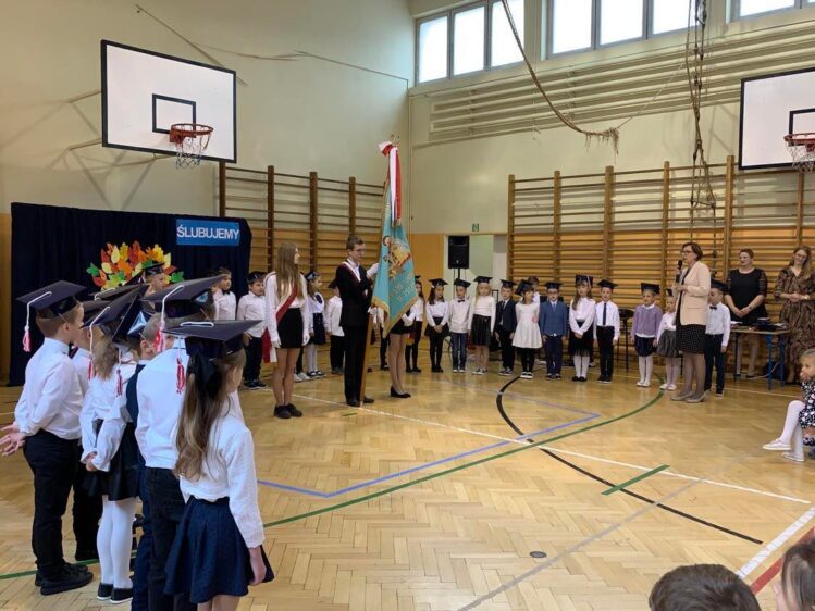 Następnie, po krótkim występie artystycznym, uczniowie klas pierwszych zostali przyjęci w poczet uczniów Szkoły Podstawowej  im. Króla Jana III Sobieskiego. Było podniośle,  a zarazem serdecznie i radośnie. W ramach konkursu „Odblaskowa Szkoła” wszyscy pierwszoklasiści otrzymali odblaski, aby byli bezpieczni i widoczni na drodze.