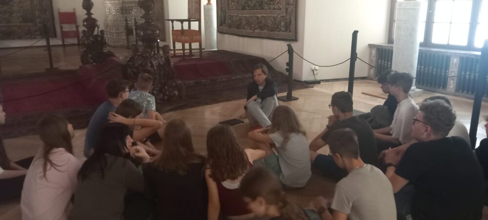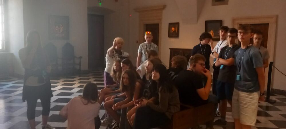 Po lekcji muzealnej przeszli do zwiedzania pierwszego piętra zamku. Oglądali tam reprezentacyjne komnaty królewskie, bogato zdobione stropy, meble z epoki, arrasy oraz portrety władców. Przewodnik opowiadał o codziennym życiu na dworze królewskim, ceremoniach oraz znaczeniu poszczególnych pomieszczeń.