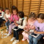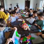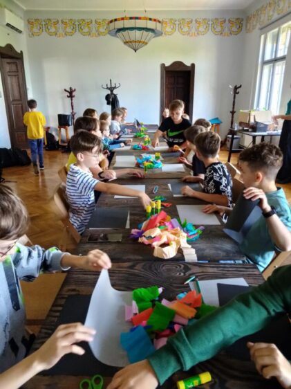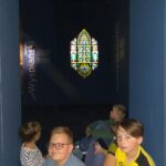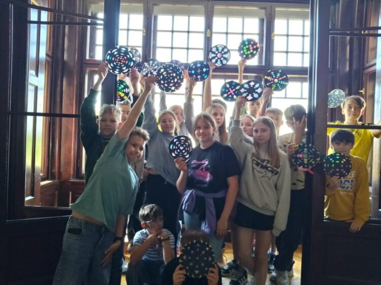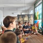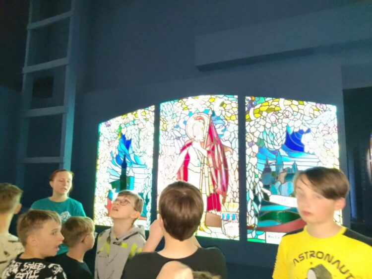 Głównym punktem programu była wizyta w Muzeum Witrażu, gdzie uczniowie nie tylko poznali historię i technikę tworzenia witraży, ale także wzięli udział w warsztatach artystycznych. Podczas zajęć każde dziecko miało okazję wykonać własny papierowy witraż w formie rozety. Uczniowie z zaangażowaniem wycinali i naklejali swoje prace, wykazując się kreatywnością i starannością. Gotowe rozety prezentowały się niezwykle kolorowo i efektownie.